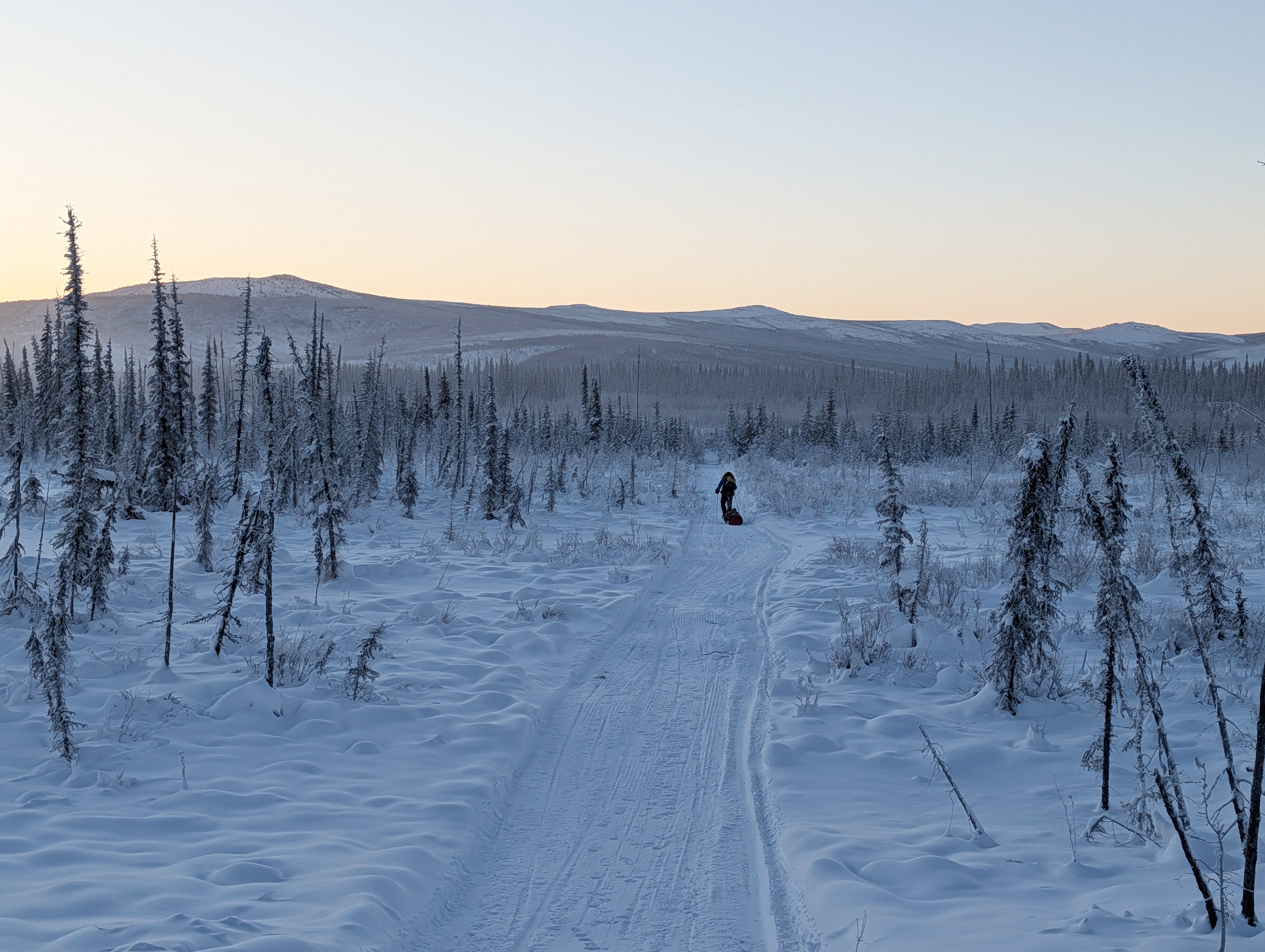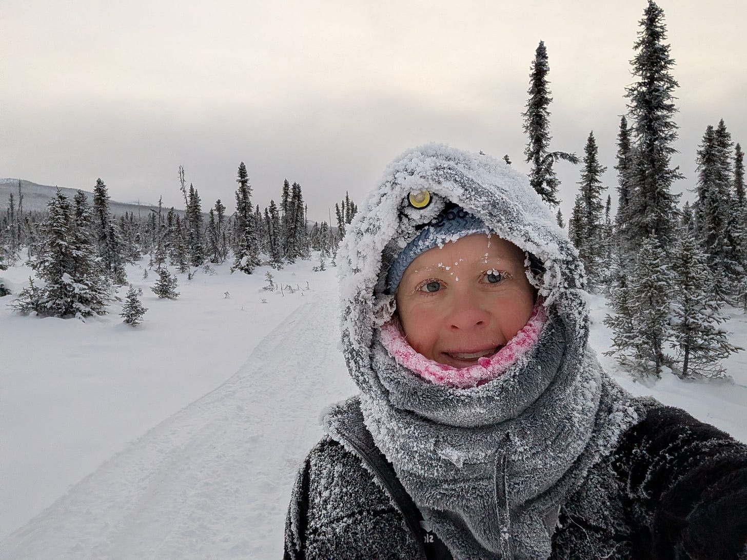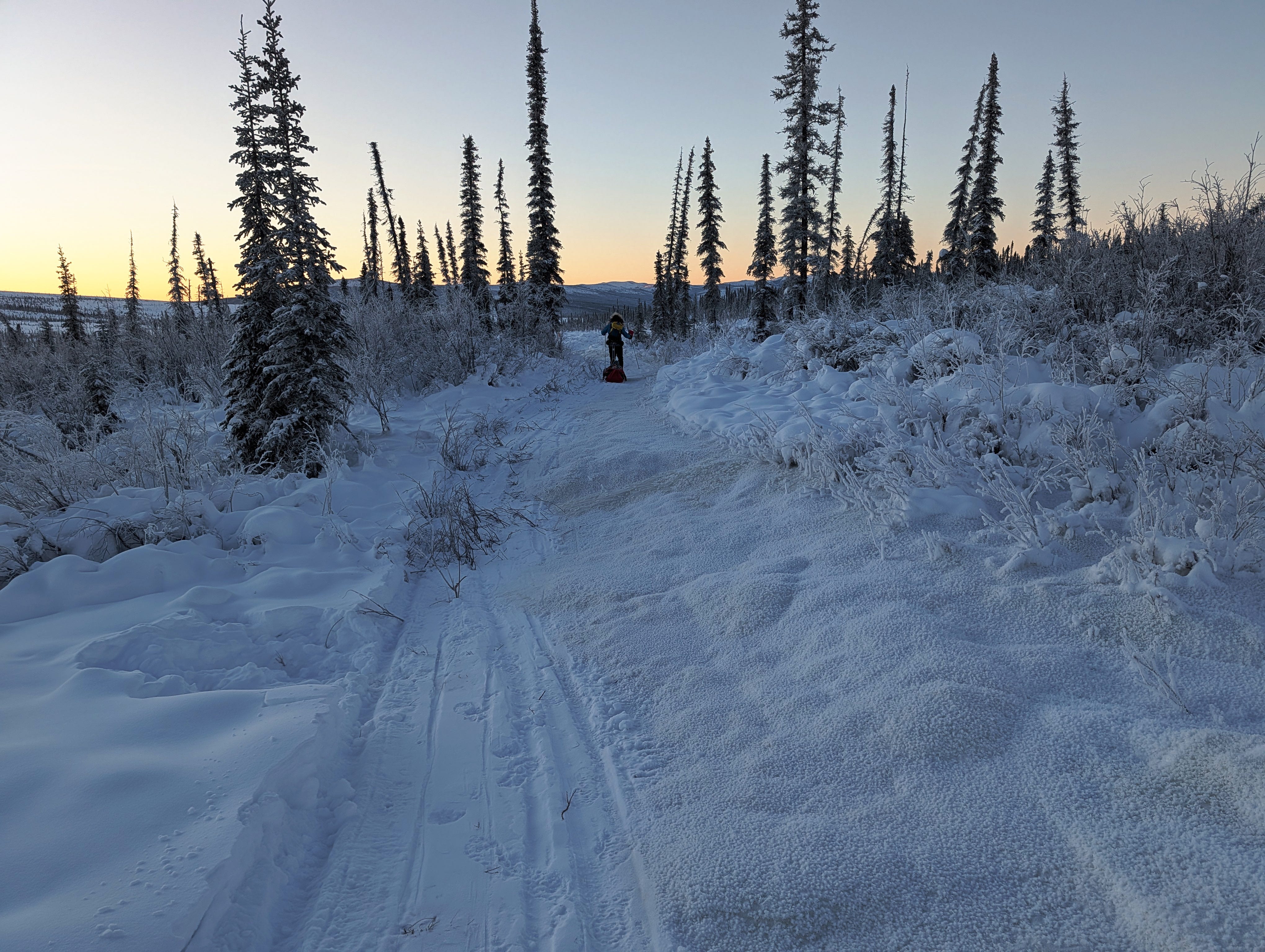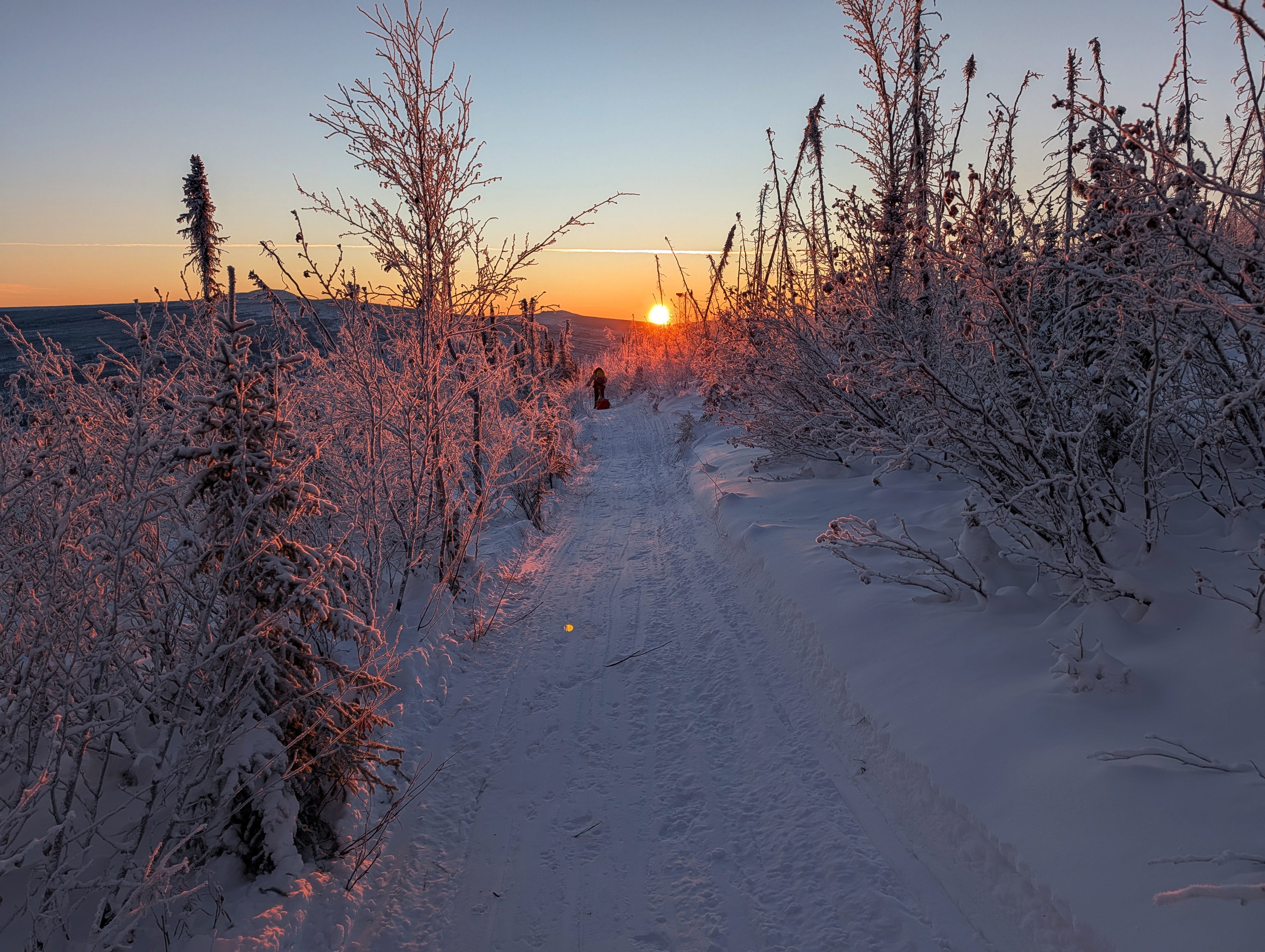 Beat and I flew into Fairbanks in the midst of Northern Alaska’s most prolonged cold snap in many years. Temperatures were forecast to remain in the negative double digits, save for perhaps a hiccup toward zero around Christmas, for the entire 2.5 weeks we planned to stay. We were intimidated but also excited, weary from the prolonged heat wave in Boulder. For most of December, we’ve been beleaguered by high winds and temperatures that would be better suited to June. The sound of wind rattling the house day and night, combined with constant red flag fire danger, had frayed my last nerves. On Wednesday, I went outside to run in a T-shirt, braced against a howling 40-50 mph gale that tossed me all over the trail, and came home to a power outage that would last for days. On Thursday, I got on a plane and stepped into the expansive silence of 20 below.