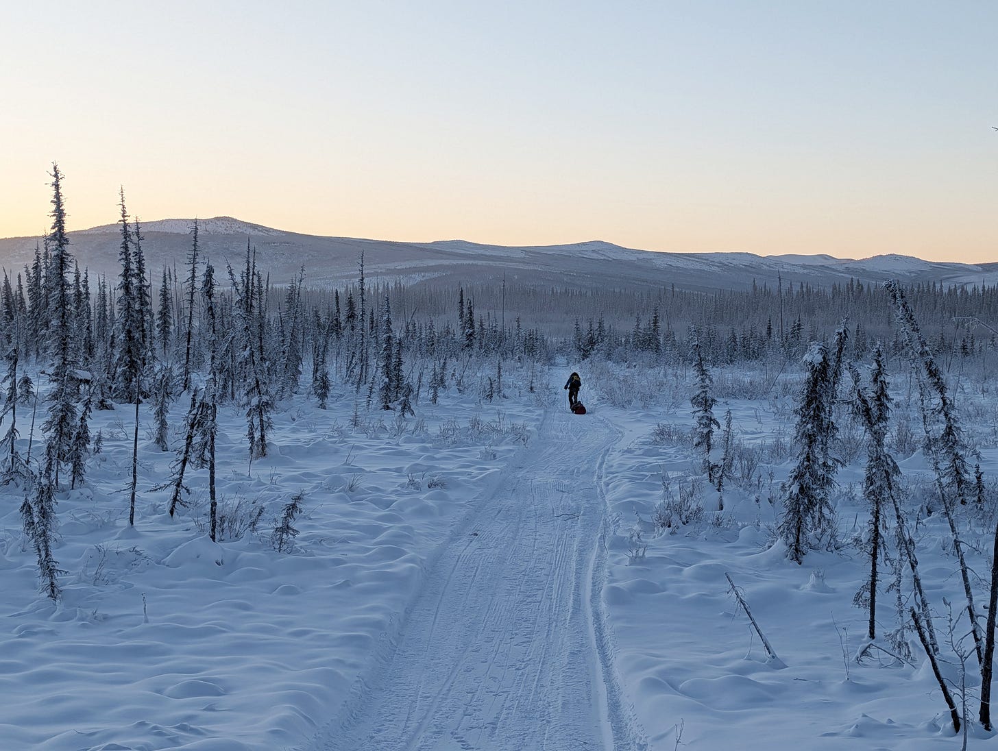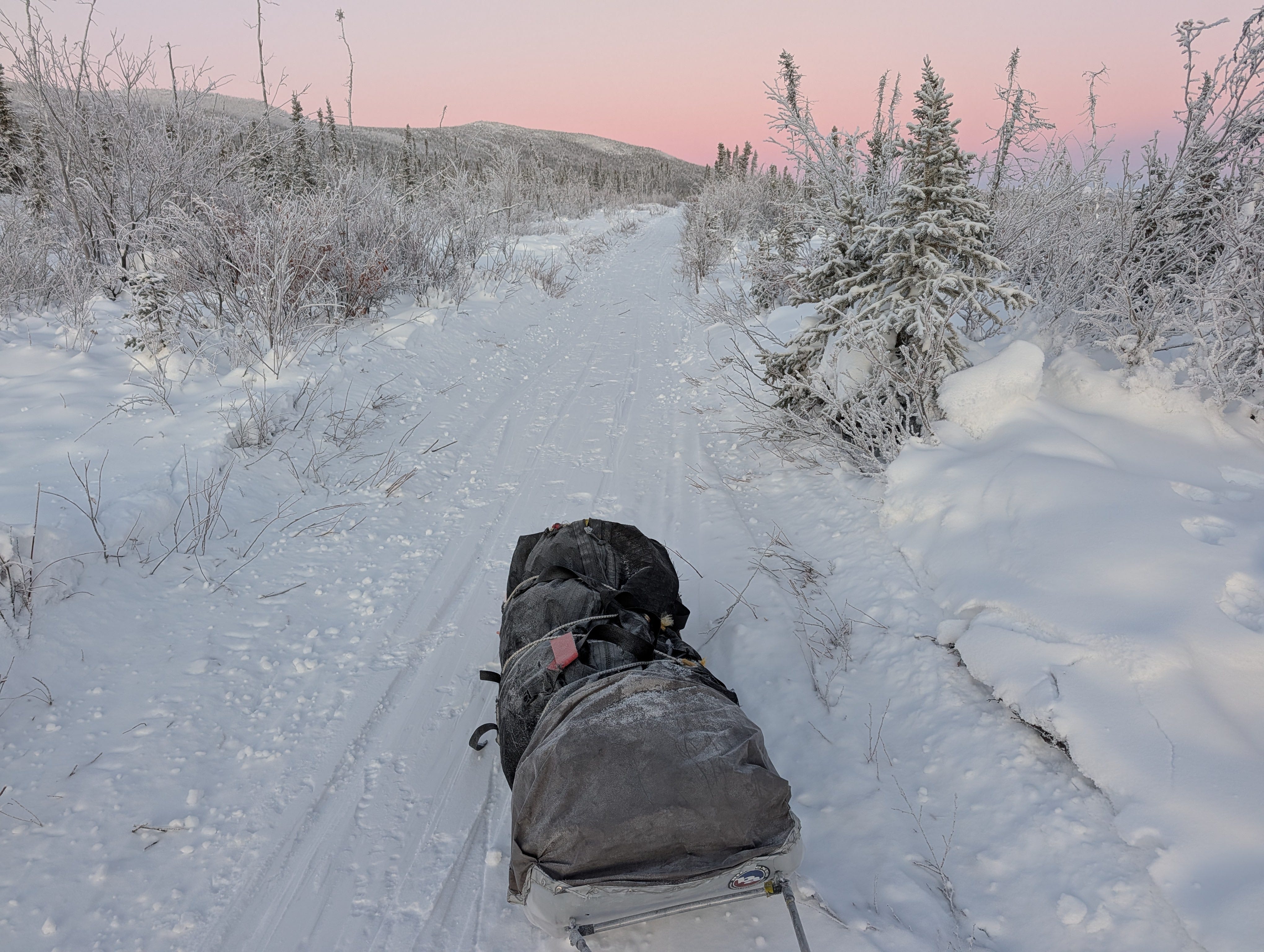 I was about four miles into day four, dragging across the lowest and coldest point on Wickersham Creek — 42 below — when my sled harness snapped and I had a minor calamity. Old-time Alaska explorer and mountaineer Hudson Stuck famously said, “Everything is okay when it's 50-below as long as everything is okay.” And yes, 42 below is not 50 below. I’ve experienced 50 below — only once — and even then, there’s an incredible shift in reality in these small increments. So many things freeze, break, and fail that you’d never expect.