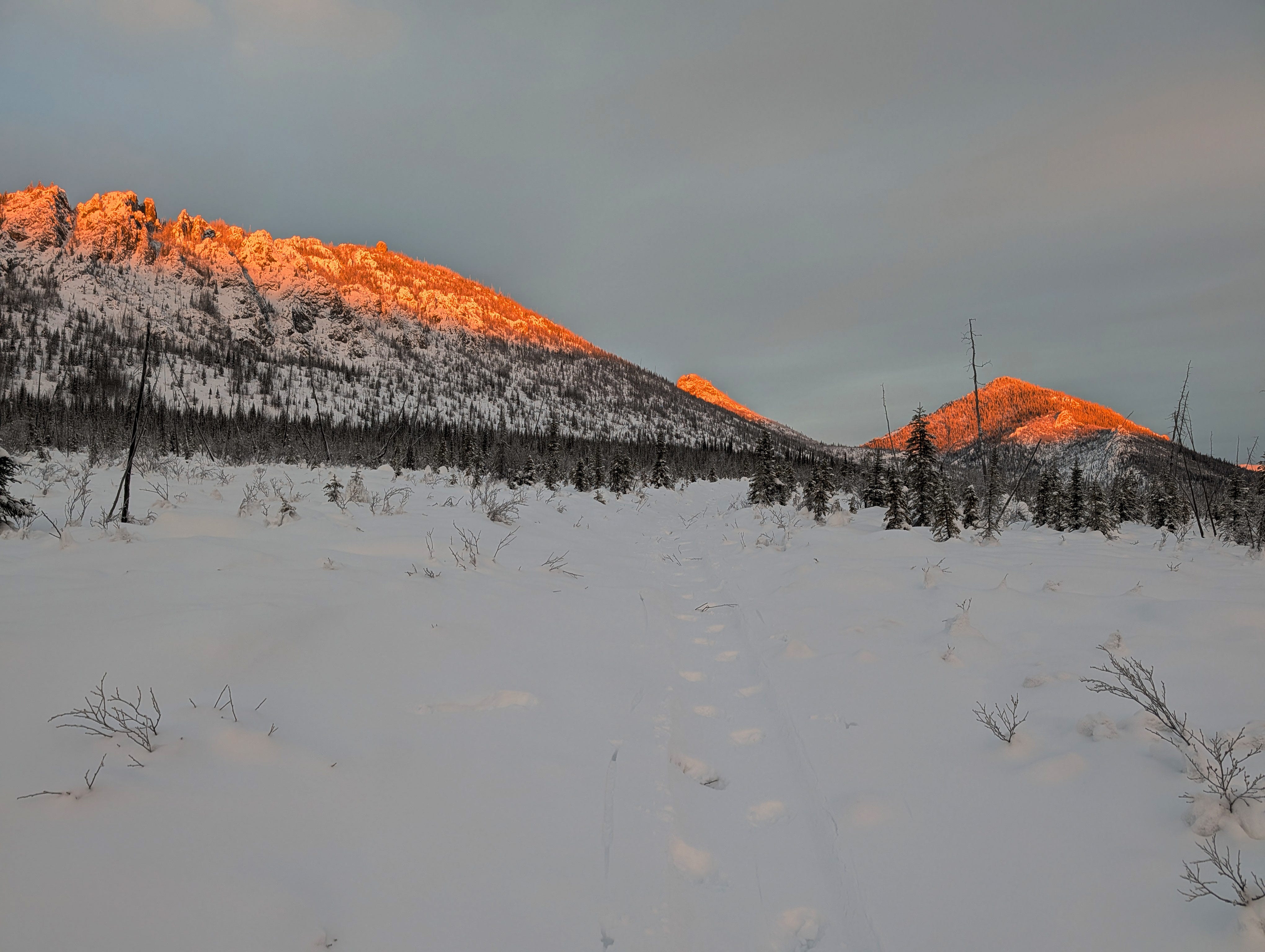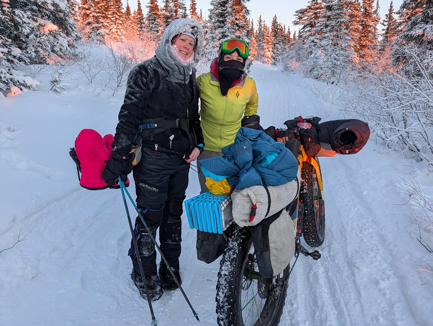 I was a half mile from the trailhead, back in the high, balmy climes of the ridge where it was 15 below, when I encountered the first humans we’d seen on the trail in four days. My friend Christina had come up from Anchorage to take a friend on her first winter bikepacking trip. We warned of the 40 below temperatures that awaited, and ultimately, they’d have their own misadventures with the danger cold, but that would be their story to tell.