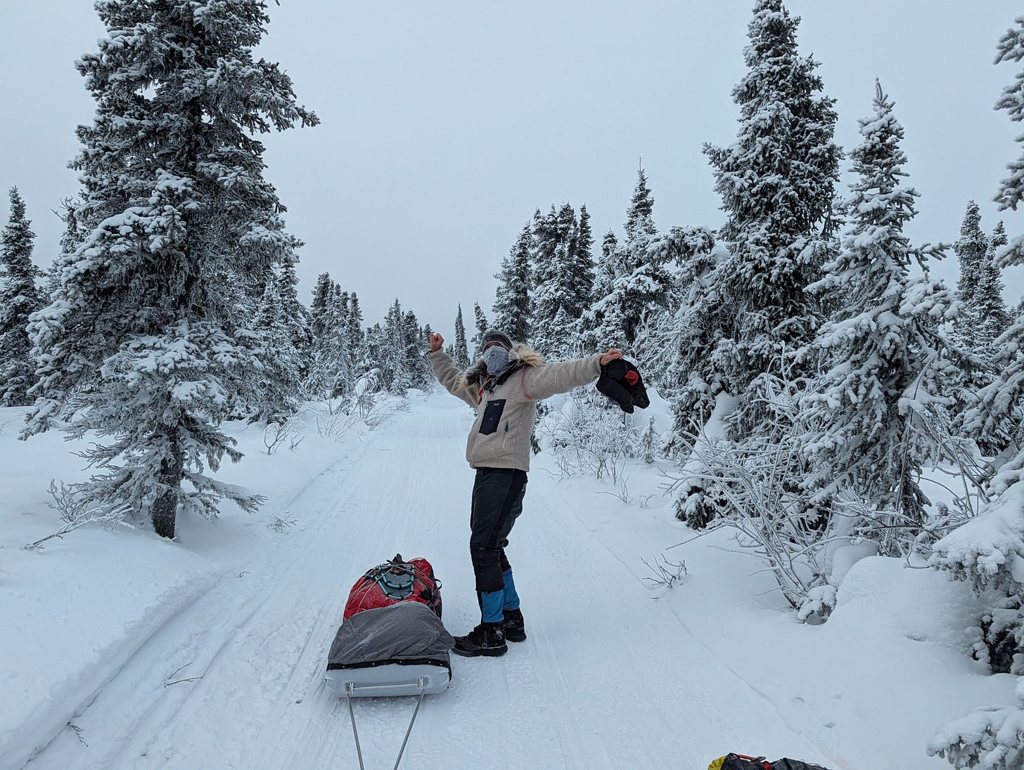 Our first day on the trail — 19 miles to Borealis cabin — was overcast and calm. The cold snow was predictably abrasive, and dragging a laden sled that I hadn’t touched in almost 365 days predictably felt like dragging a dead body through molasses. Beat and I keep our own pace when it’s so cold, as stopping for more than a few minutes can become an ordeal (as I noted above.) So I was all alone in this black-and-white world without even the occasional gray jay to keep me company. Every once in a while, a pink strand of tape tied to a tree would pop like an electric neon sign, and I’d recognize how deprived I’d been of color. I’d stuff a handful of dried cherries into my mouth, experience a zing of electric tartness, and recognize how deprived I’d been of any semblance of taste or smell in this frozen world. I retreated into meditative breathing and felt wholly at peace.