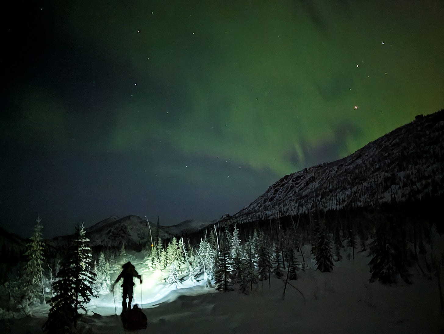 It was a rough day with my tender ribs and trying to keep my ragged body watered and fed as I marched through the ever-skulking phantom of 40 below. It took me nearly five hours to slog out the 10 miles to Caribou Bluff cabin, but this perch on a minor ridge above Fossil Creek is one of my favorite spots in the world. And we were rewarded with a clear night and gorgeous Northern Lights.