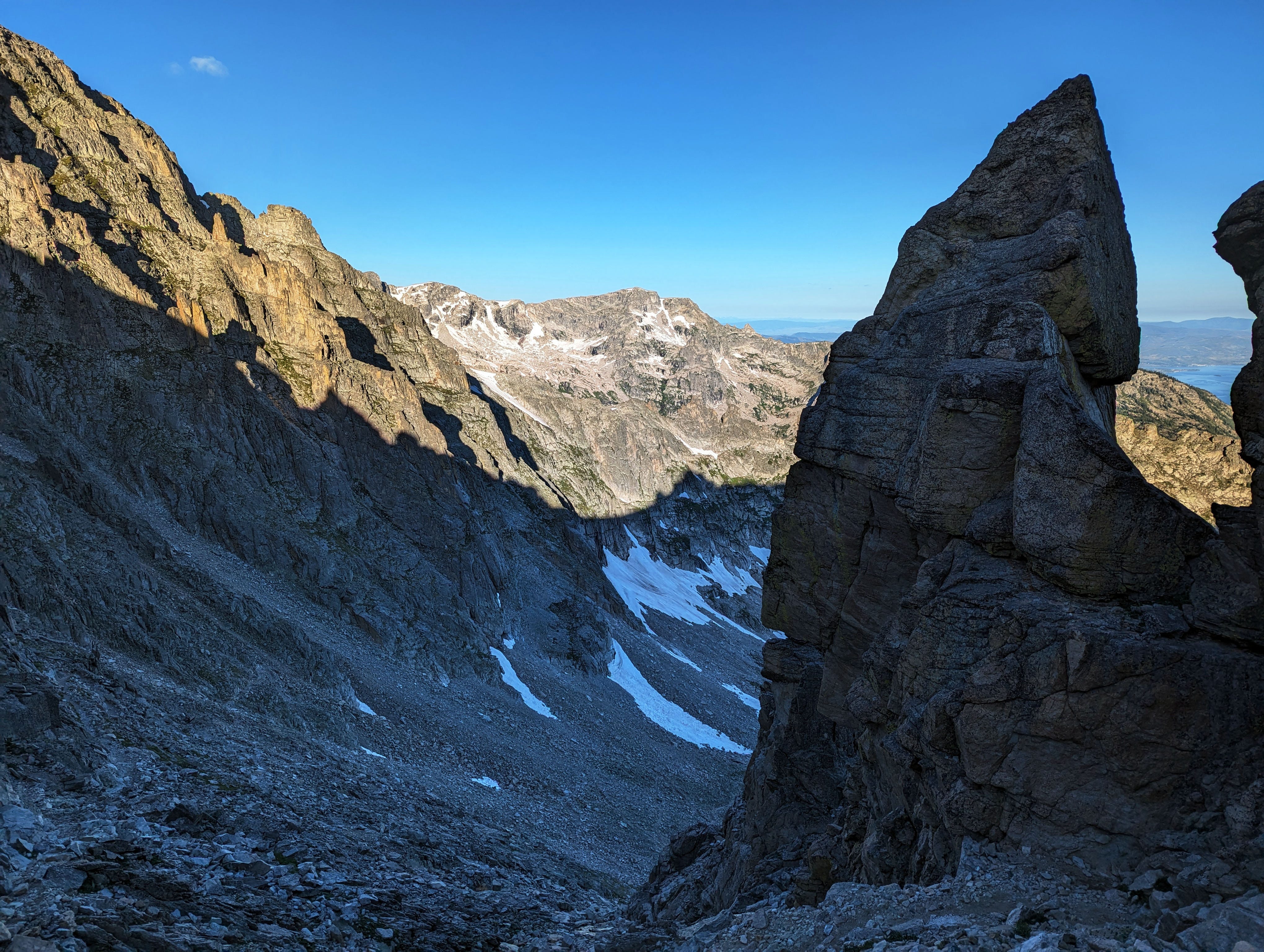 One year ago, a rockslide took out about 200 vertical feet of switchbacks off the west side of Pawnee Pass. I hadn’t been up here since the rockslide, and this is the first time I’d tried this loop in the clockwise direction, which meant descending the pass rather than climbing it. So I had no idea where to go and couldn’t see where the trail continued through the talus. I picked a descent line that looked reasonable but quickly became so steep and loose that I started clutching whatever pebbles I could grasp to prevent myself from sliding backward. It was precarious and the clutching caused sharp pains in my bad hand.