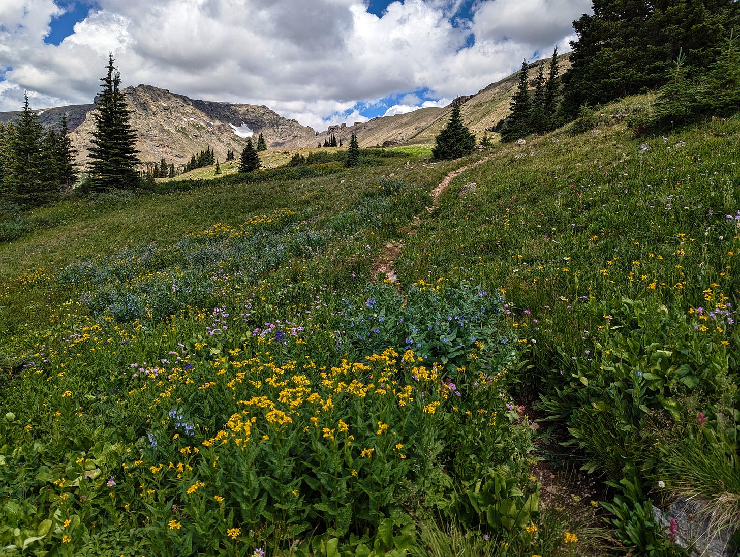 It’s true that Buchanan Pass is lower and less steep than Pawnee Pass, but it still requires more than 3,000 feet of ascent and I was tackling the climb with tired legs and wheezy lungs. The clouds grew darker and the pass only stretched farther away as I trudged. I heard one thunder rumble and started hyperventilating. I was closing in on a panic attack. I stopped to rest in a cluster of trees that would be far from safe in a thunderstorm — for safety, I’d have to backtrack to a spot much lower into the woods — and wondered if I should stop and wait it out. No, the rational side of my brain warned me. You’re not safe here. And it’s not even noon. You’re going to have to wait out the entire day on the wrong side of the Divide. Also, these clouds are fairly typical and not necessarily threatening, although those clouds on Niwot Ridge did also not seem all that threatening before they rained static electricity down on you, so really, the rational side of my mind also knows nothing and you should probably not listen to it, either.”