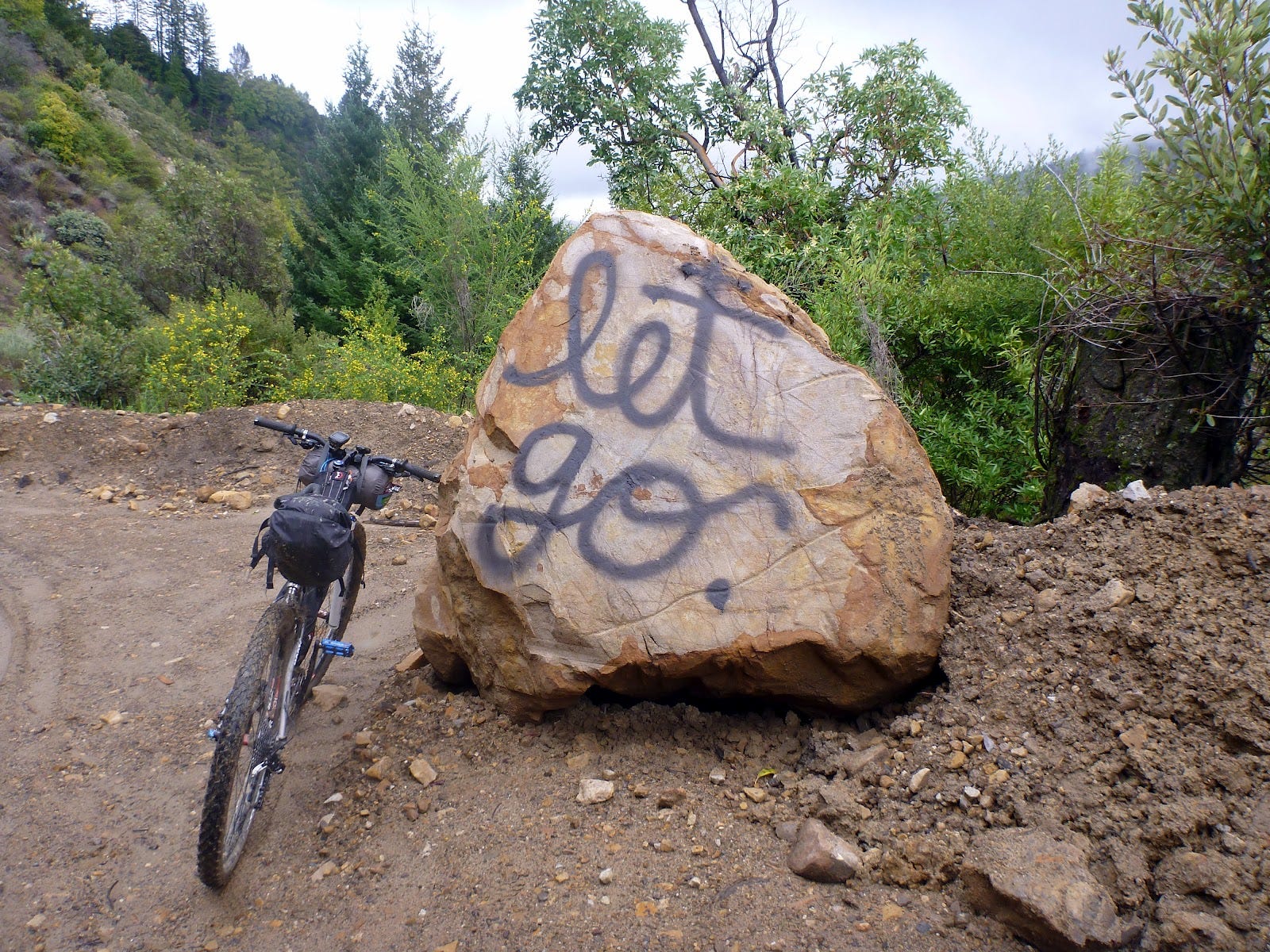 Unsurprisingly, nearly every mile of my route was much harder than I’d anticipated. Through the coastal mountains, long-disused fireroads cut straight up and back down fall lines: muddy, 25% grades that were littered with deadfall. Some of the dirt roads had been closed to vehicles for many years, reclaimed by landslides and fires. Many of my planned trails were closed to all use, gated, and plastered with scary no-trespassing signs. I got lost. I ran out of food, I nearly ran out of water, and I got caught in a rare coastal thunderstorm that was awe-inspiring in its violence. I made it as far as San Louis Obispo, pretty broken by the experience, and was able to call Beat for a rescue because his race had been cancelled due to flooding caused by that awe-inspiring rain. That was the trip that introduced the depth of vulnerability and isolation I could experience in what I thought was an overpopulated and wholly civilized state — vulnerability and isolation that can be found anywhere in this big, scary world. It was also the trip where I came across this bit of graffiti scrawled on a boulder that had plummeted off a hillside onto the highway, and then moved into a road pullout: