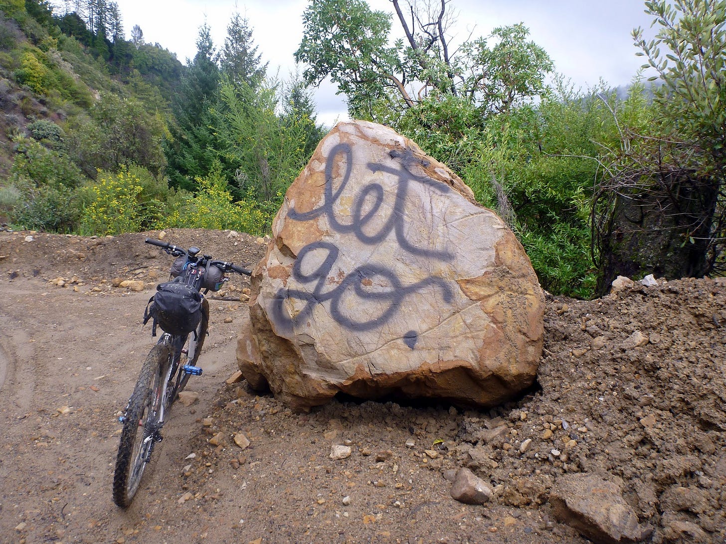I encountered this boulder on the first day of my trip off of Skyline Drive, and thought about it many times over the next couple of days. I thought about it when I was lost on a dead-end road many miles from seemingly anywhere, so hungry I tried to steal an empty bag of Doritos from a crow, or watching lightning crack over the Pacific Ocean as I pedaled through the darkness on an empty Highway 1. “Let go. Just let go.” (This was also, I want to note, a year before Frozen and “Let It Go.” So I did not break into song.) It was the best mantra to calm my rattled nerves. I had chosen this, and now I had little control over my situation. All I could do was let go — let go of my pain, let go of my fear, let go of my hunger — and keep moving forward.
